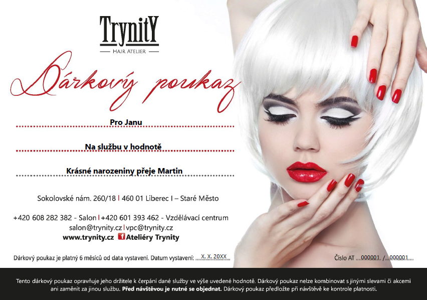 Veškeré poukazy a balíčky lze zakoupit v Ateliérech Trynity, nebo objednat elektronicky na salon@trynity.cz s veškerými požadavky. Elektronické poukazy jsou vytvořeny přímo na míru dle vašich požadavků. Doručení probíhá mailem a úhrada se provádí na bankovní účet po obdržení poukazu s platebními údaji a údaji k tisku.